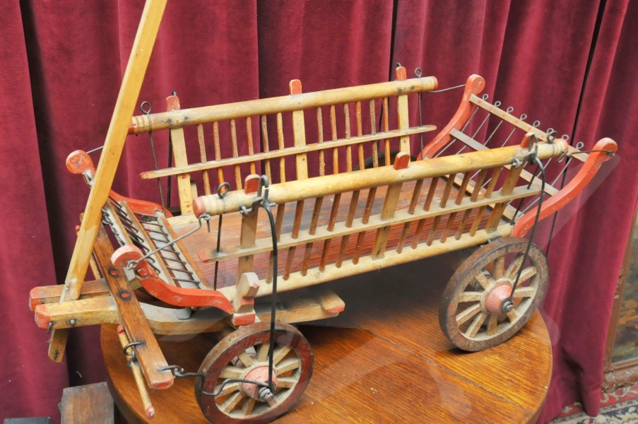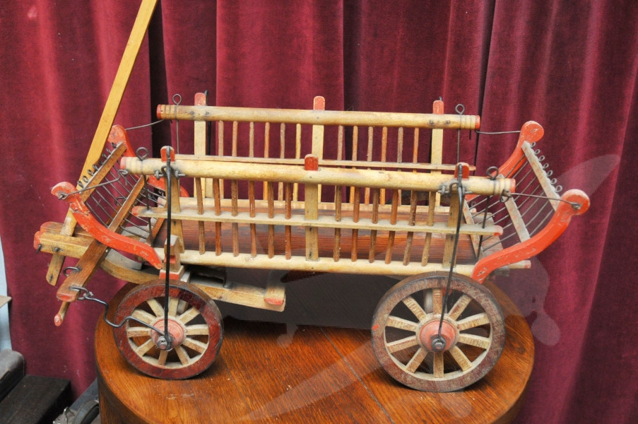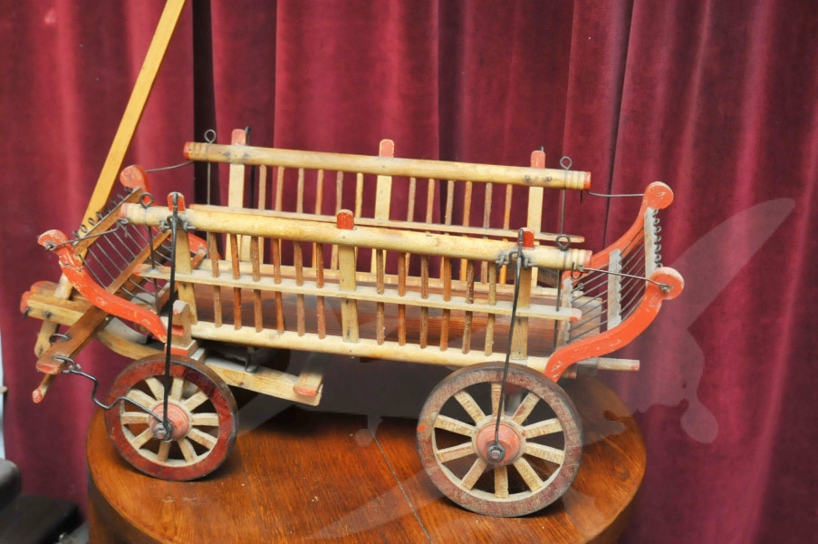 Vozík je velice detailně a precizně zpracovaný. Materiál – tvrdé dřevo. Délka 67, šířka 34 a výška 30 cm. Vozík má odnímatelnou oj v délce 89 cm.